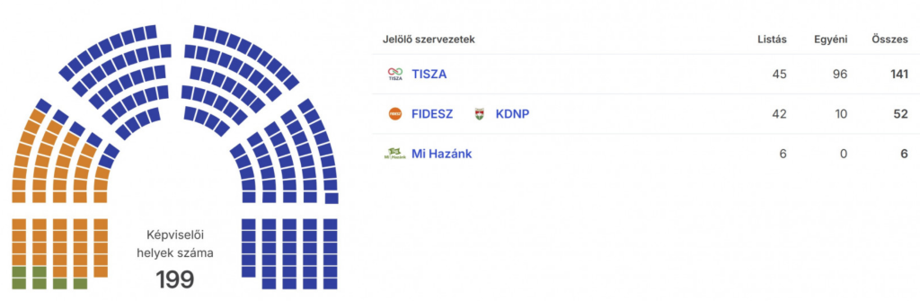 După numărarea tuturor voturilor, partidul Tisza (Respect şi Libertate) şi-a crescut majoritatea parlamentară de la 138 la 141 de mandate (din totalul de 199). Diferența au făcut-o voturile prin corespondenţă, cele din străinătate şi cele transferate, a anunţat autoritatea electorală de la Budapesta, preluată de agenția Reuters.