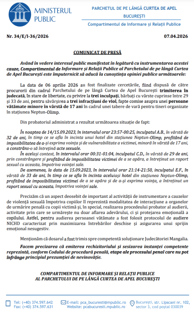Parchetul de pe lângă Curtea de Apel Bucureşti a transmis marţi, printr-un comunicat de presă: ”La data de 6 aprilie 2026 au fost finalizate cercetările, fiind dispusă de către procurorii din cadrul Parchetului de pe lângă Curtea de Apel Bucureşti trimiterea în judecată, în stare de libertate, cu privire la trei inculpaţi, bărbaţi cu vârste cuprinse între 29 şi 33 de ani, pentru săvârşirea a trei infracţiuni de viol, fapte comise asupra unei persoane vătămate minore în vârstă de 17 ani, în cadrul unei tabere de vară pentru tineri organizate în staţiunea Neptun-Olimp”.
