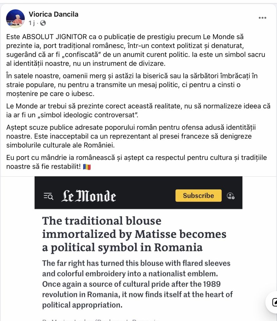 „Este ABSOLUT JIGNITOR ca o publicație de prestigiu precum «Le Monde» să prezinte ia, port tradițional românesc, într-un context politizat și denaturat, sugerând că ar fi «confiscată» de un anumit curent politic. Ia este un simbol sacru al identității noastre, nu un instrument de divizare. În satele noastre, oamenii merg și astăzi la biserică sau la sărbători îmbrăcați în straie populare, nu pentru a transmite un mesaj politic, ci pentru a cinsti o moștenire pe care o iubesc”, scrie supărată doamna Dăncilă.