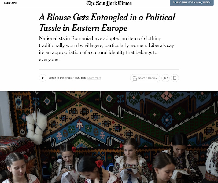 Iată ce ce scria „New York Times”, prin corespondentul său Andrew Higgins, într-un articol din 24 mai 2025: “Bluza tradițională, în centrul unei polemici politice în Europa de Est. În România, naționaliștii și-au apropriat o haină tradițională purtată la sate de către femei. Liberalii denunță o confiscare a unui bun comun, aparținând tuturor”.
