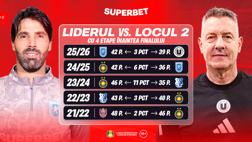 FCSB merge la Miercurea Ciuc pentru a-și consolida poziția de lider în play-out, iar atenția e captată de derby-ul Universitatea Craiova – Dinamo, precedat de un U Cluj – FC Argeș, în play-off.